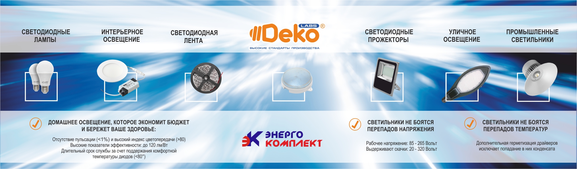 В торговой сети "Энергокомплект" представлен большой ассортимент продукции, выпускаемой под брендами DEKOlabs и ГЕНСВЕТ - это светодиодные светильники различного назначения. Они ценятся за высокие световые показатели, стабильное качество и доступные цены.