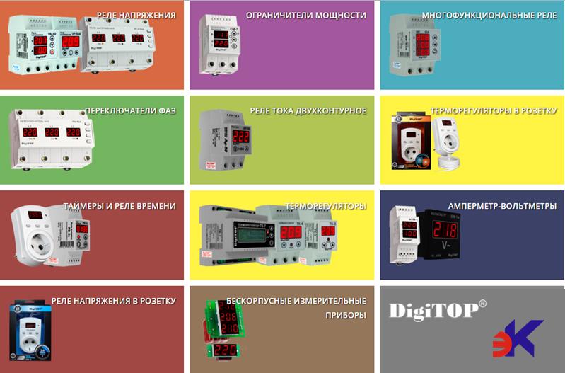DigiTOP (Ди джи топ) - это почти все виды цифрового низковольтного оборудования: от терморегуляторов, реле напряжения, программируемых реле времени до измерительных приборов, таких как цифровые вольтметры, амперметры, термометры.