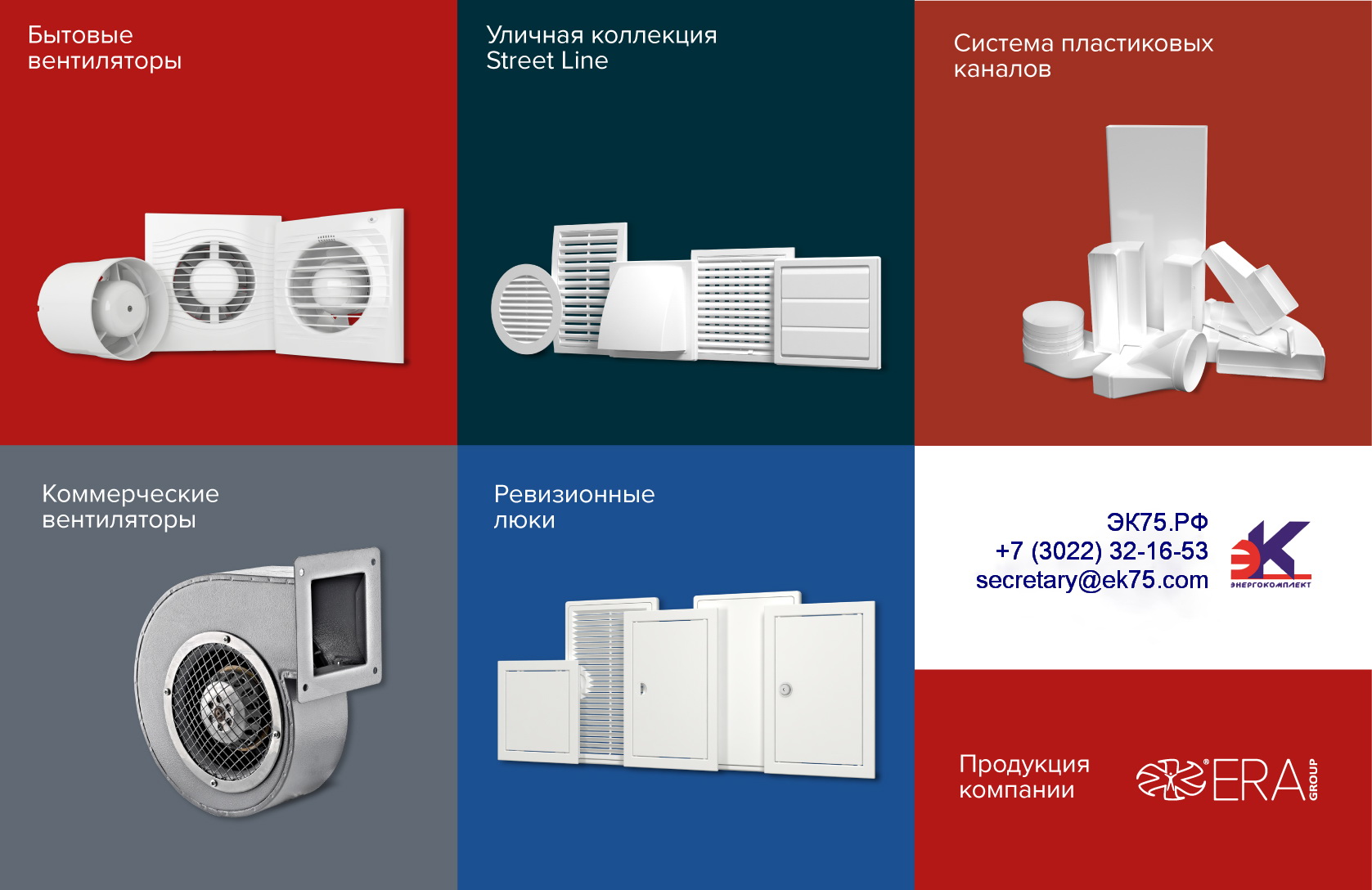 "ERA Group" — это вентиляционные системы и комплектующие, в том числе бытовые и коммерческие вентиляторы, воздухораспределители и воздуховоды.Все это представлено в торговой сети "Энергокомплект"