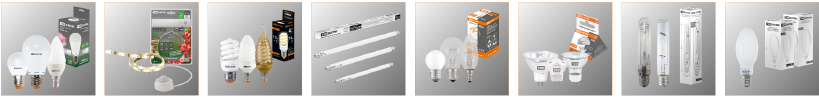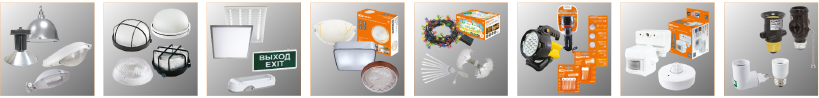 Промышленное освещение; уличное и архитектурное освещение; освещение объектов ЖКХ; офисно-административное освещение; торговое освещение; аварийное освещение; ландшафтное и садово-парковое освещение; светильники ФИТО для рассады и растений; праздничная подсветка; декоративное бытовое освещение; фонари; элементы питания; аккумуляторы и зарядные устройства; управление светом; комплектующие для светильников