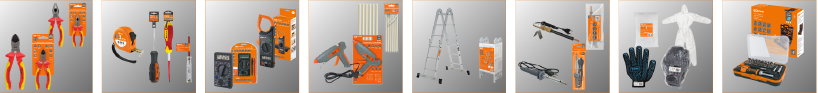 Электромонтажный инструмент; слесарный инструмент; измерительный инструмент и оборудование; электроинструмент и оснастка; паяльное оборудование, химия и аксессуары; клеевые пистолеты и аксессуары; системы хранения и переноски инструмента; лестницы и стремянки; средства индивидуальной защиты